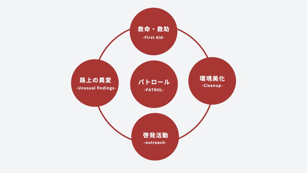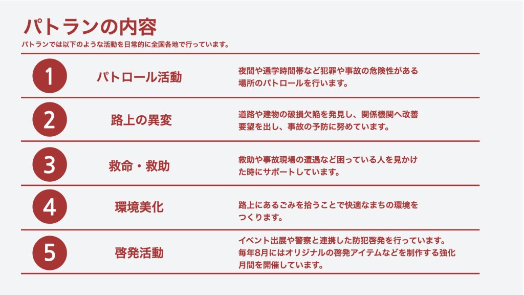パトランでは独自の集計ツール「パトっち」を活用し、活動による実績を可視化しています。人数、時間、人助けや通報、まちのインフラ改善など10項目をデータ集計しています。